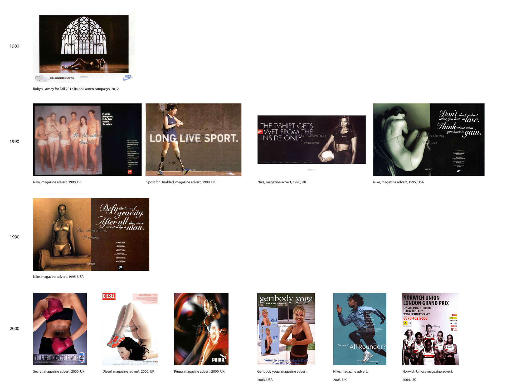 Sesenta y nueve imágenes, principalmente de revistas y periódicos, constituyen las diferentes categorías a través de las cuales destaco signos particulares que conectan el cuerpo femenino con diferentes roles sociales: la ama de casa, la esposa que sufre, la belleza delicada, la femme fatale, la estrella del porno chic, la mujer sin cabeza, la mujer impotente, el objeto femenino inanimado, la mujer empoderada, la diosa, la mujer real y la heroína deportiva. Las posturas reiterativas, los gestos y las asociaciones con elementos, espacios y prácticas —por ejemplo, lavar los platos o cocinar la cena—permitieron crear dichas categorías de mujeres, todas ellas reforzadas por el poder de la imagen publicitaria.