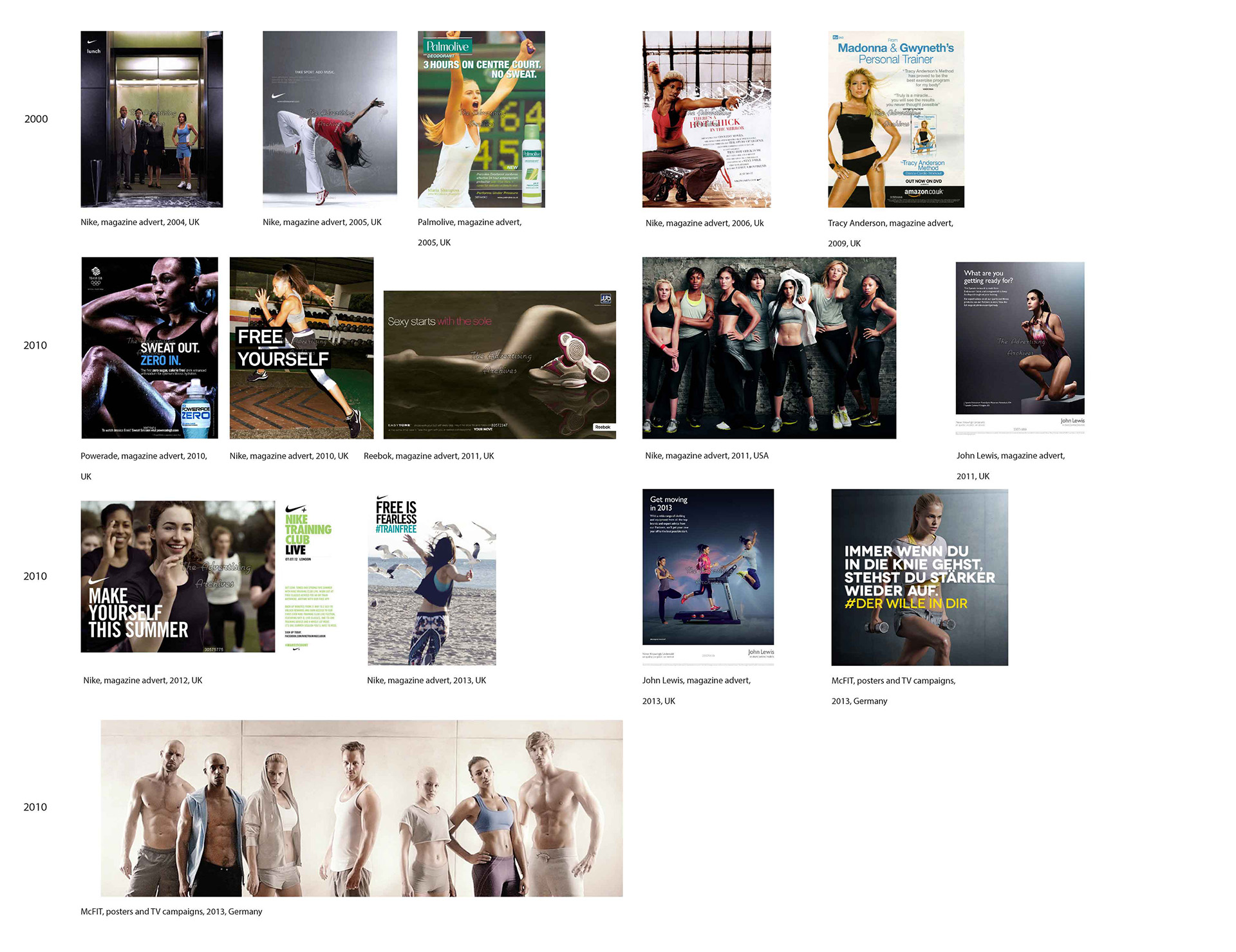 Después de analizar más de 30 campañas publicitarias, organicé 71 imágenes en 12 categorías, teniendo en cuenta poses (topoi) y gestos, a veces reforzados por textos escritos particulares; referencias al arte y al cine y redundancias con discursos de género.